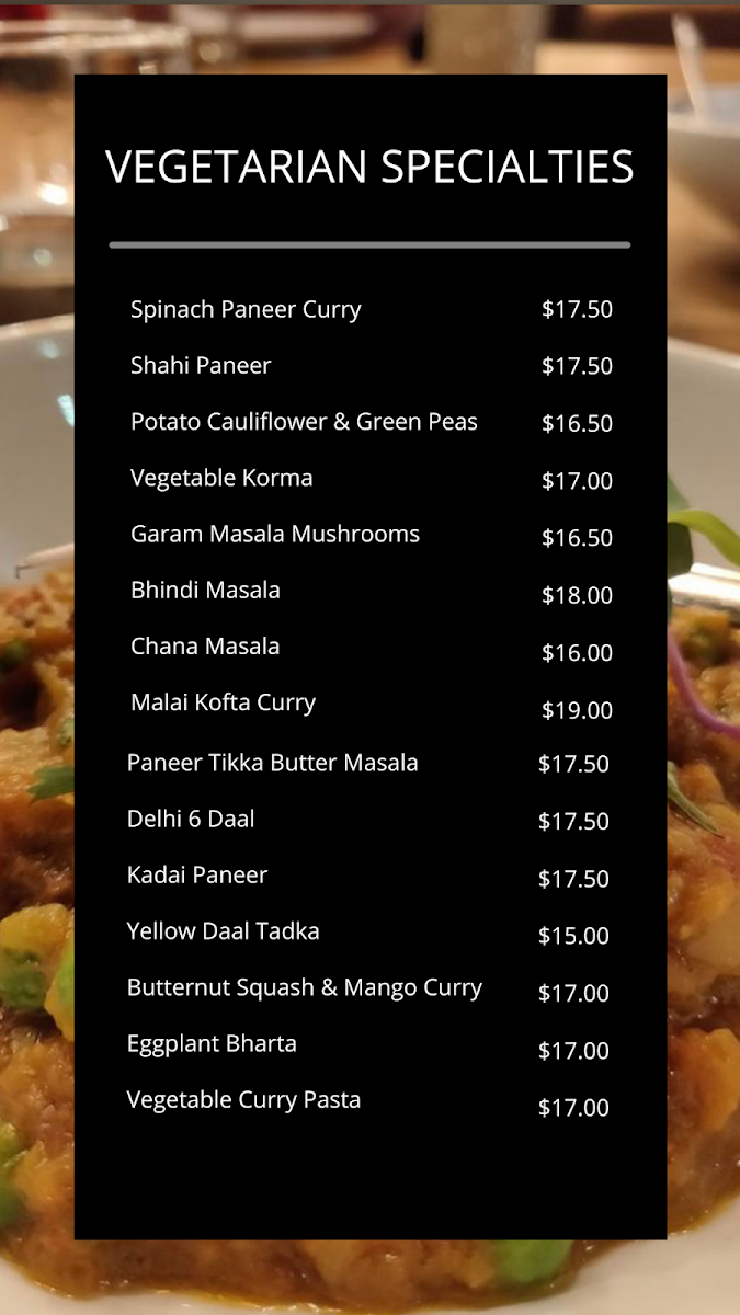 The menu offers a diverse selection of traditional Indian dishes with a focus on Punjabi and North Indian cuisine, suitable for casual dining, takeout, or bar service. It is structured to include signature dishes, seafood specialties, red meat specialties, and desserts, providing options for various meal preferences throughout the day.
